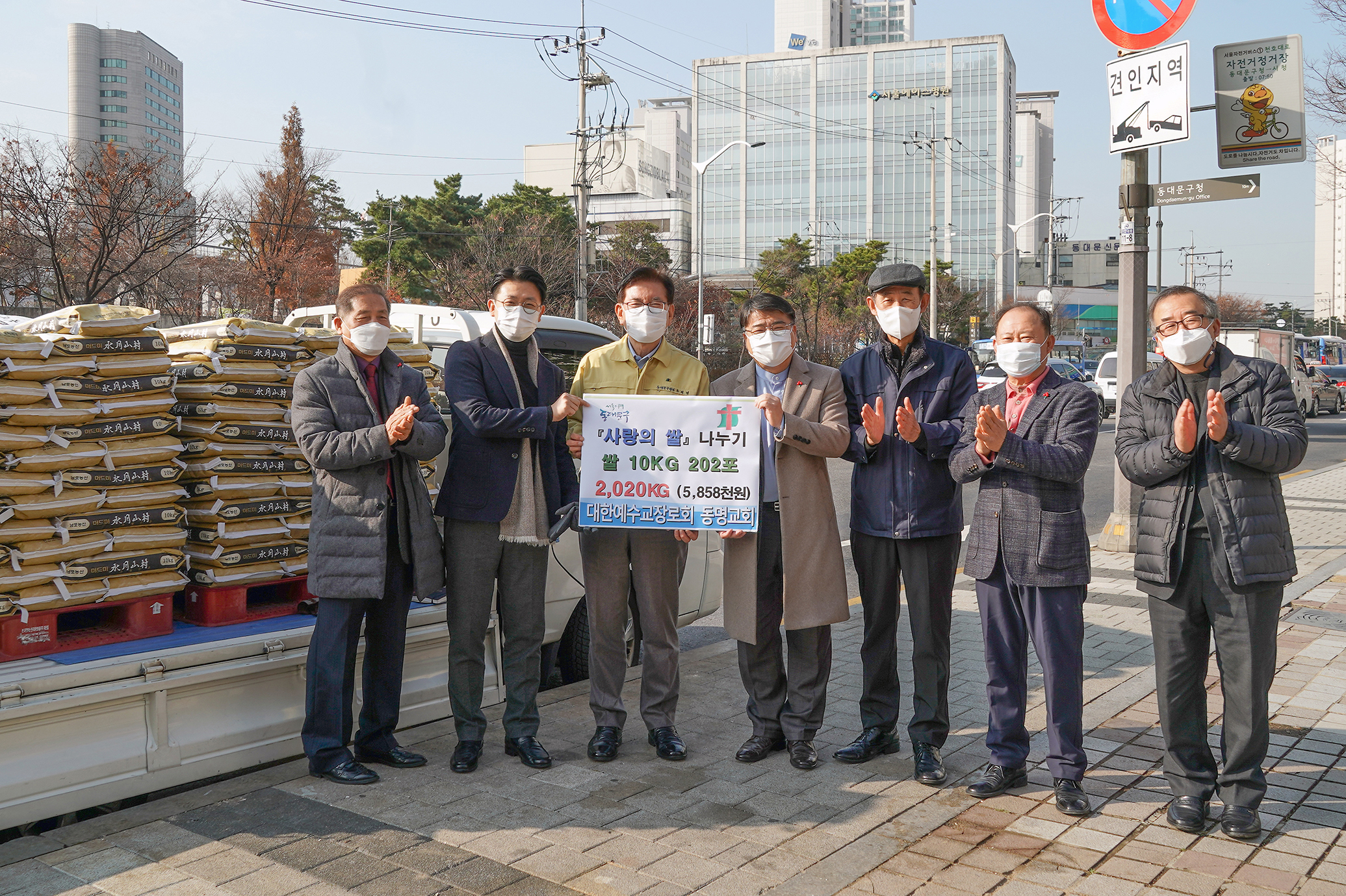 2020.11.25 동명교회(담임목사 최학식)가 25일 오전 11시 동대문구청을 방문해 소외된 이웃을 돕기 위해 마련한 ‘사랑의쌀’ 202포를 기탁했습니다. 6년부터 이웃 나눔을 실천하기 위해 동대문구에 쌀, 성금 등을 꾸준히 기탁해 온 동명교회는 올해 코로나19로 어려운임에도 불구하고 ‘사랑의 쌀’ 2,020kg(10kg/포, 환가액 585만 원 상당)를 동대문구에 전달했습니다.이로써 동명교회는 2016년부터 이날까지 동대문구에 쌀 총 544포(환가액 1800여만 원)와 성금 40만 원을 기탁했습니다. 이날 전달받은 ‘사랑의 쌀’을 용신동, 전농1동, 제기동, 답십리1동 등 기초생활수급자 및 차상위계층에게 배부할 예정입니다. |
