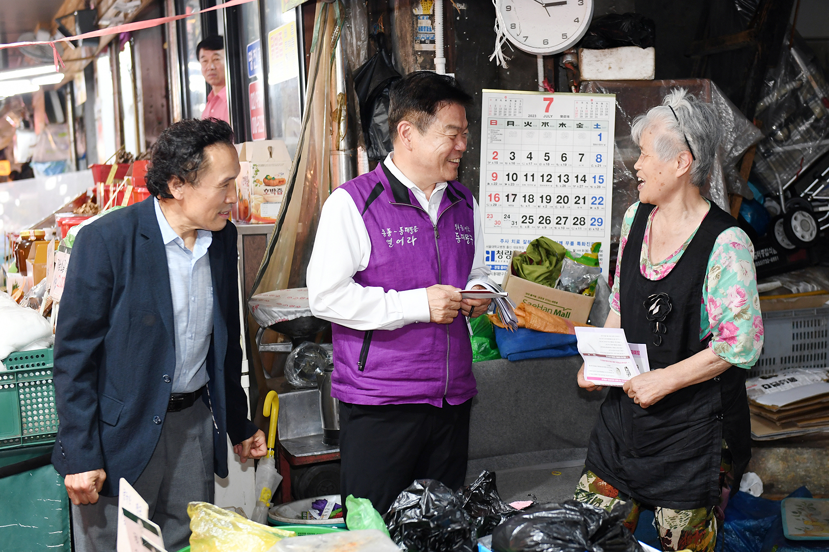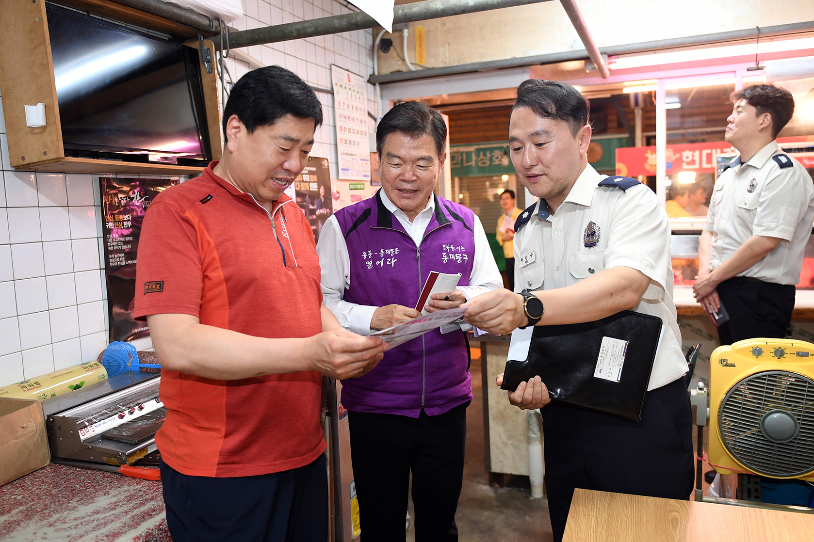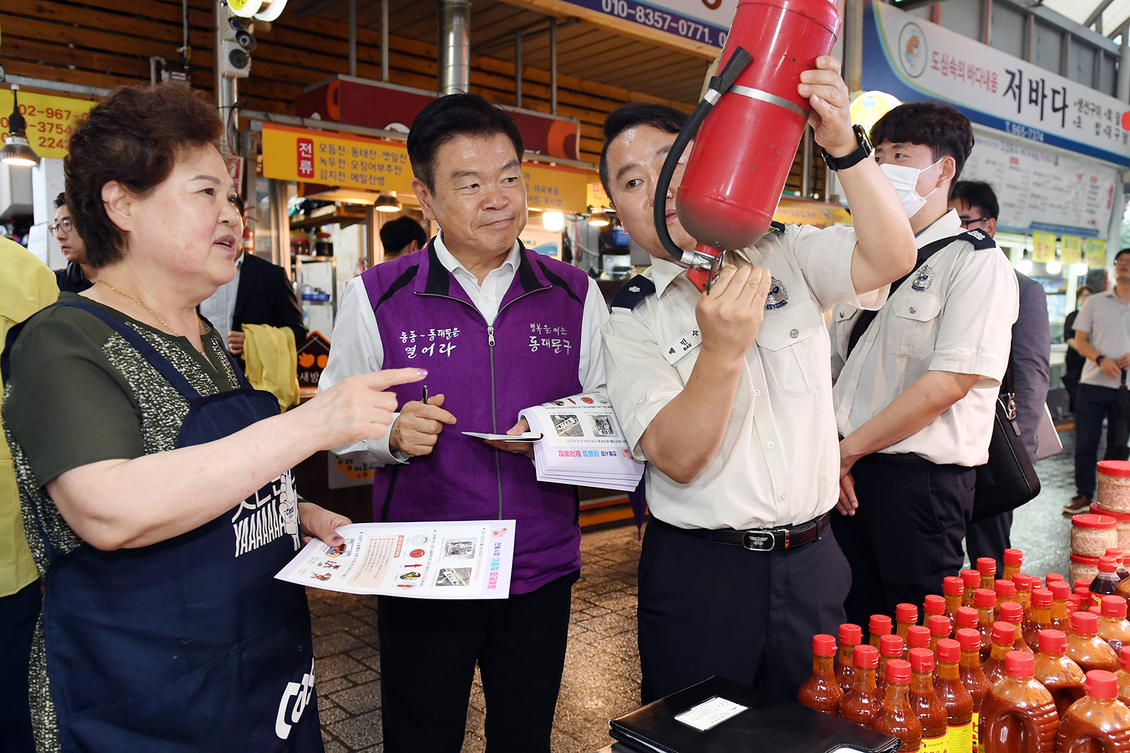 2023.7.13. 이필형 동대문구청장은 청량리 전통시장을 방문하여 점포당 1개씩 비치된 소화기의 사용법을 안내하고, 비상소화 장치함 위치를 상인들에게 다시 한 번 알리며 화재예방 활동으로 구슬땀을 흘렸습니다. 동대문구(구청장 이필형)는 올해 4월부터 주민들의 불편과 애로사항을 구청장이 직접 듣고 함께 고민하는 ‘현장 구청장실 「주민소통 현장톡톡」운영을 시작했고, 지난 6월 중순에는 민선8기 1주년을 맞아 14개동 전체를 순회하며 다양한 주민들의 의견을 수렴했습니다. 상반기 ‘현장톡톡’ 운영으로 동대문 현안 문제의 해답은 현장에 있다는 결론을 내려, 하반기부터는 매주 목요일마다 주민들의 생생한 목소리를 듣기 위해 현장을 방문하고 있습니다. 이날 찾은 청량리 전통시장은 주민과 함께하는 여섯 번째 현장이었습니다. 여름철 전력 사용량 증가에 따른 화재를 예방하기 위해 전통시장 전기 안전점검을 실시하고 ▲시장 주변 소화기 위치 확인 ▲화재․열감지기 위치 및 작동방식 안내 ▲낡은 실외기 및 콘센트 주변 먼지 제거 ▲소방차 진입로 적치물 및 불법노점 정비 ▲화재 시 대피로 안내 등 화재예방을 위한 안전수칙 준수를 당부했습니다. 또한 일상생활 속 작은 부주의로 화재가 발생할 수 있고, 전통시장은 작은 불도 순식간에 대형화재로 이어져 막대한 인명과 재산 피해를 초래할 수 있음을 다시 한 번 환기했습니다. 민선8기 구정철학인 「쾌적·안전·투명·미래」도시를 달성하기 위해 공약사업과 주요 현안사업 추진 시 주민 목소리를 경청해야 하는 곳은 어디든 방문할 계획입니다.