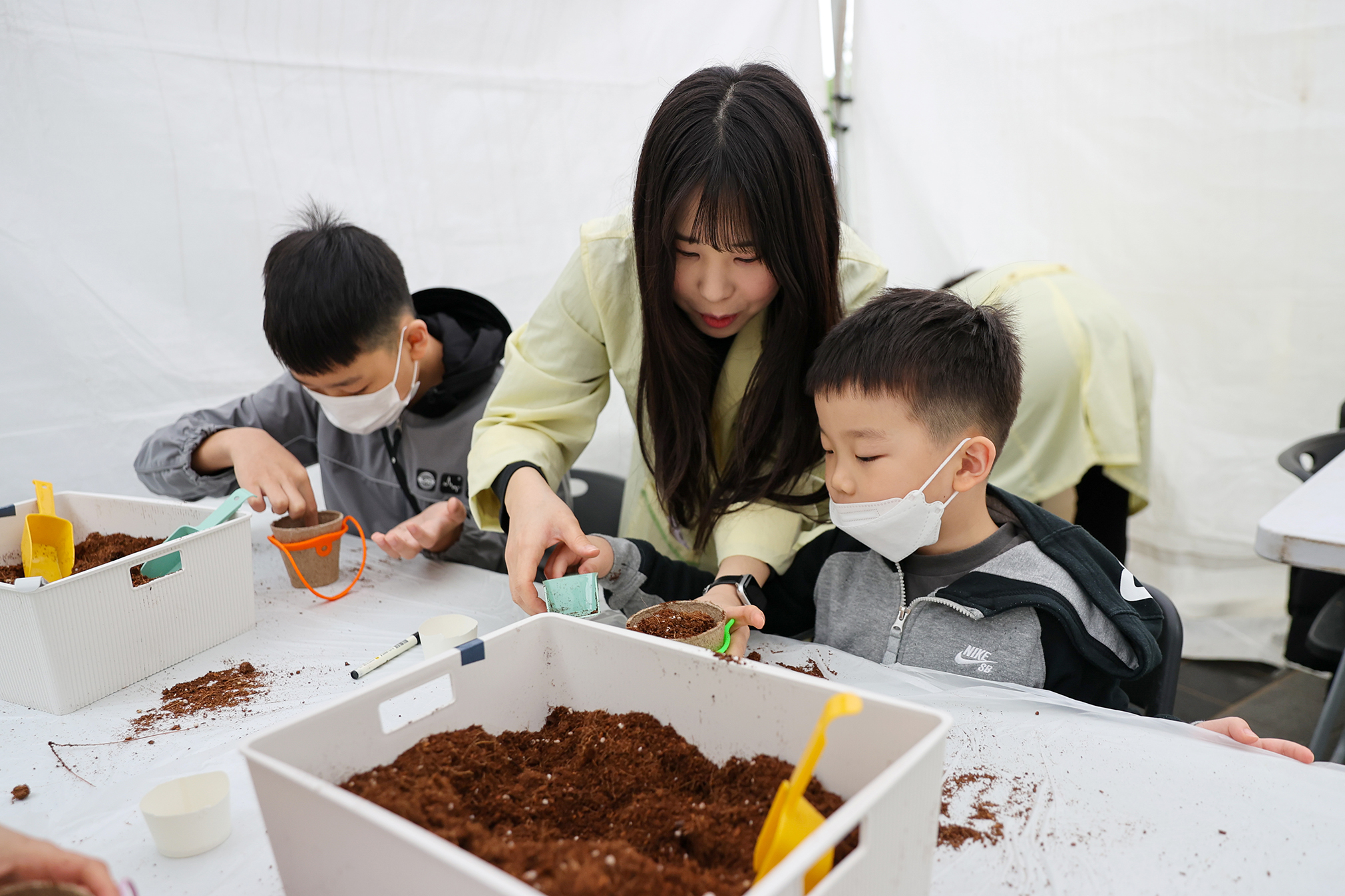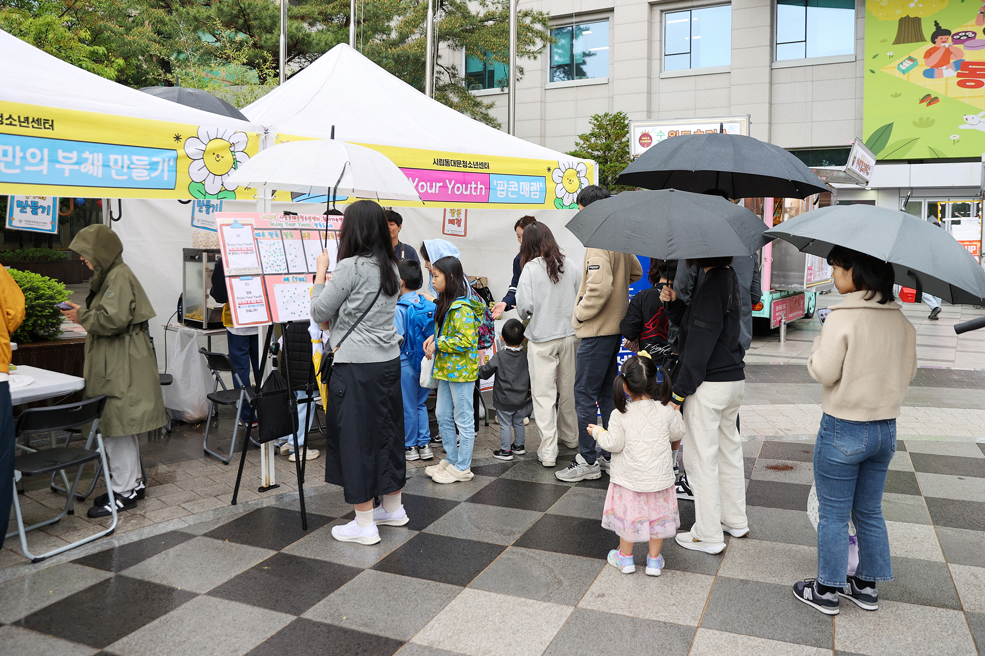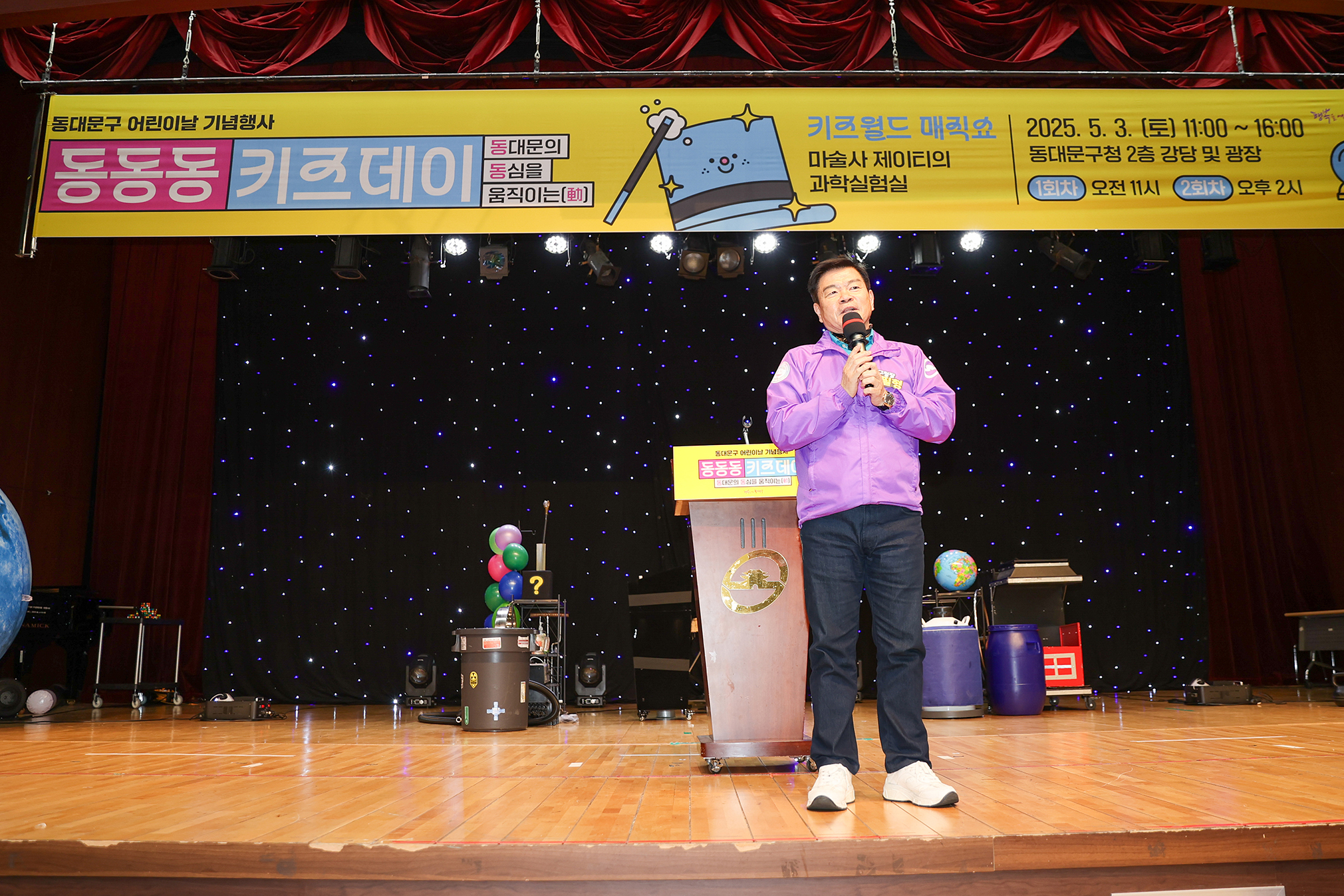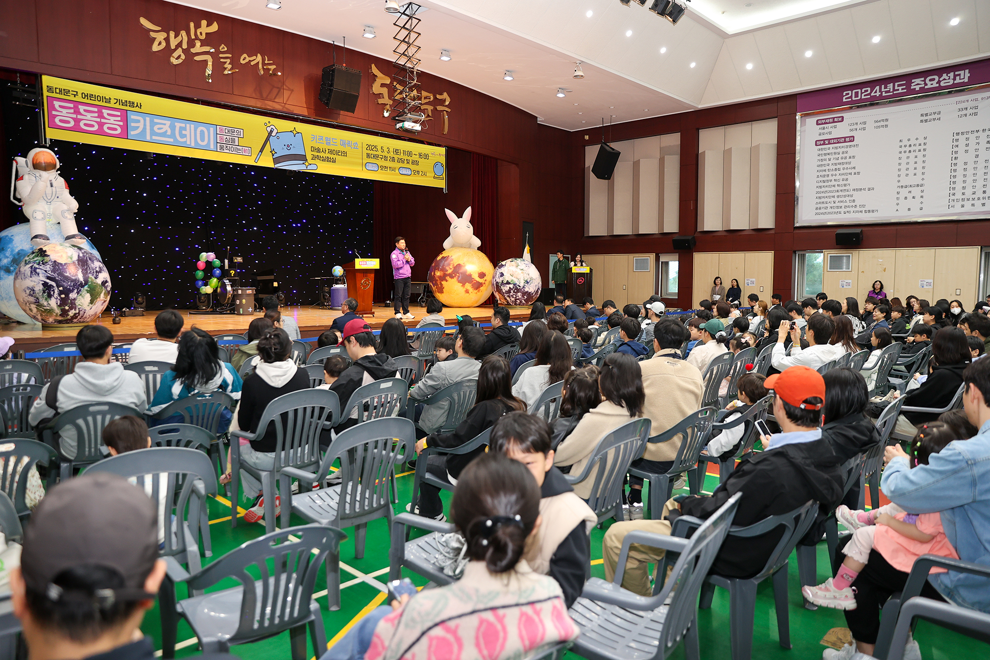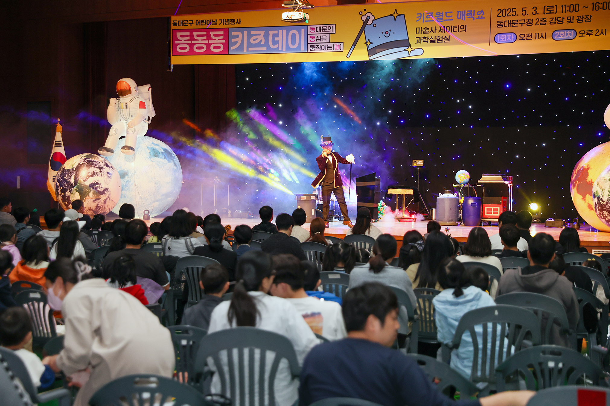 | 2025.5.3. 제130회 어린이날을 맞아 구청 강당과 지식의 꽃밭(서울시립도서관 부지, 전농동 691-3)에서 ‘동동동 키즈데이’를 개최해 어린이들에게 특별한 하루를 선물했습니다. ‘동대문의 동심을 움직이는(動)’이라는 의미를 담은 이날 행사는 다양한 공연과 체험 프로그램으로 아이들과 가족들의 큰 호응을 얻었습니다. 구청2층 강당에서는 마술사 제이티가 과학 개념을 마술로 표현한 ‘과학마술’과 레이저쇼로 어린이들의 눈과 귀를 사로잡았고, 광장에서는 ▲버블놀이터 ▲키즈낚시 ▲나무놀이터가 마련돼 즐거움을 더했습니다. 또한 시립동대문청소년센터, 청소년상담복지센터, 어린이급식관리지원센터, 유니세프한국위원회의 정책과 프로그램을 알 수 있는 체험 부스도 운영됐습니다. 같은 날 ‘지식의 꽃밭’에서 열릴 예정이었던 ‘초화원 아트스케치’는 우천으로 인해 맞은편 동대문중학교 강당에서 진행되었습니다. |