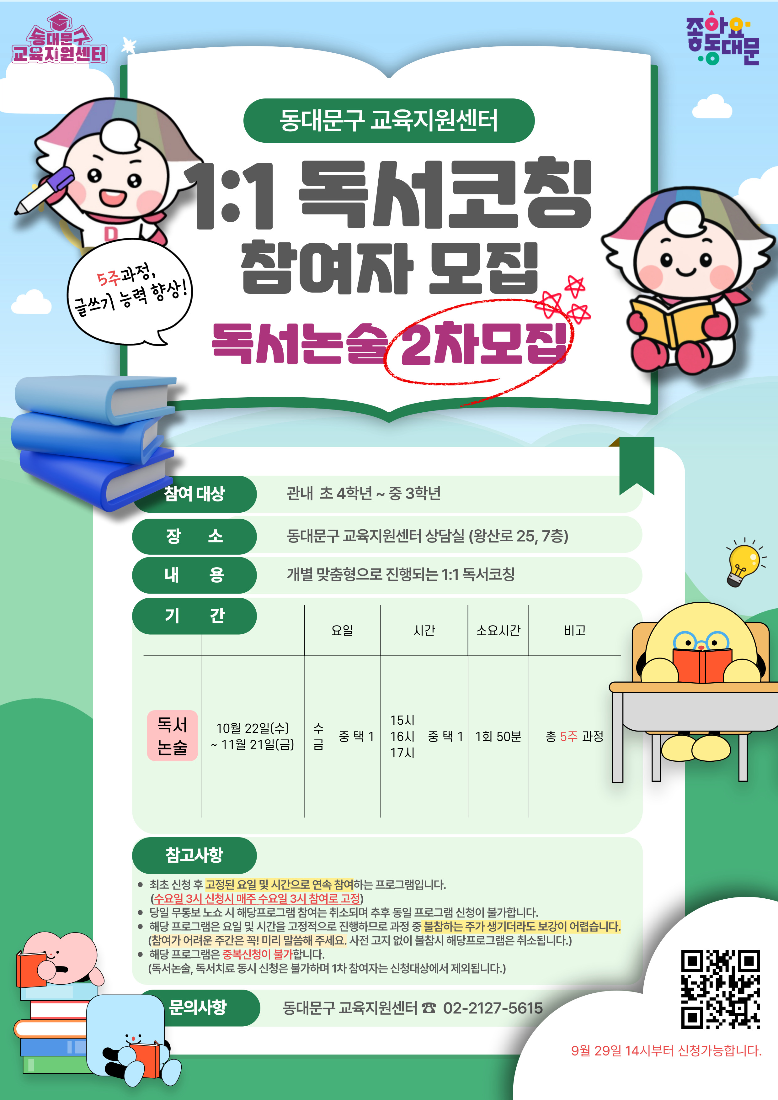동대문구 교육지원센터에서는 10월 22일(수)부터 진행되는 독서논술 2차 참여자를 모집합니다. 해당 프로그램은 ★9월 29일(월) 14시★부터 신청하실 수 있으며, 자세한 사항은 포스터 및 신청 페이지 내 안내사항을 확인해주시기 바랍니다. 신청 바로가기 ▶ https://linktr.ee/ddmedu ■ 1:1 독서코칭 * 기간 : 10월 22일 (수) ~ 11월 21일 (금) * 시간 : 최초 신청한 요일 및 시간에 5주간 연속참여 * 접수방법 : 네이버 폼 선착순 제출 * 대상 : 관내 초4~중3 학생 * 장소 : 동대문구 교육지원센터 (왕산로 25, 7층) * 문의 : 02)2127-5615 |