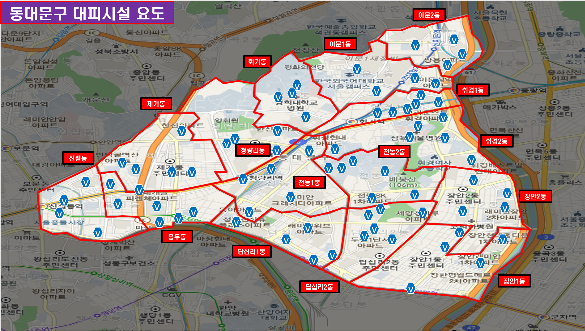 동별 대피시설 확보율 - 구분, 번호, 시설명, 규모(㎡), 수용인원(명), 위치, 지도 순으로 정보 제공