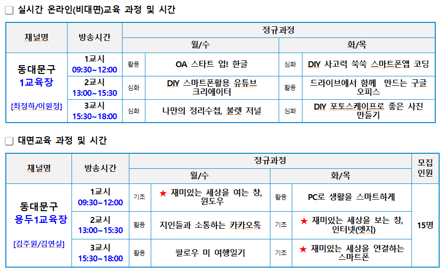 □ 교육대상 : 주민등록상 동대문구민 □ 접수기간 : 5. 25.(수) 11시 ~ 5. 30.(월) 18시 □ 선 정 일 : 5. 31.(화) 13시 이후, 수강 신청시 기재한 휴대폰으로 문자 발송 □ 수 강 료 : 무료(단, 교재는 개인 부담이나 기초생활수급자, 한 부모 가정 대상, 국가유공자(본인)은 무료지원) □ 추가접수 : 5. 31(화) 13시 ~ 6. 2.(목) 18시정보화교육 홈페이지에서 온라인접수(단, 미달과정에 한해서 추가접수 가능) □ 접수방법 : 동대문구청 홈페이지(http://www.ddm.go.kr)-예약포털-구민정보화교육에서 온라인접수 - 초급 과정에 한해 전화접수가능(☎1577-2066) ※ 전화접수는 개인정보보호법에 의거하여 본인 명의 휴대폰인 경우 인증절차를 통해 도와드릴 수 있습니다. □ 선정기준 : 다양한 구민에게 수강 기회를 드리기 위해 우선순위방식으로 수강생을 선정하고 있습니다 - 1순위 : 기초생활수급자 및 한부모가정 및 국가유공자 대상 및 각 과정별 6개월 이내 1회에 한하여 재수강 - 2순위 : 해당 과정 수강 횟수가 적은 구민 - 3순위 : 해당 과정 비선정 (탈락) 횟수가 많은 구민 - 4순위 : 연장자 ◈ (대면)교육신청 시 유의사항 ◈ - 교육 첫날 주소 및 본인 확인을 위해 신분증을 반드시 지참하시기 바라며, 본인이 아니거나 동대문구에 주민등록이 되어 있지 않으면 교육이 취소됩니다. - 추첨 1순위인 기초생활 수급자 및 한부모가정 및 국가유공자 해당되시는 분은 교육첫날 관련 증빙서류를 제출하시기 바라며, 증빙서류 미지참시 교육이 취소됩니다. - 아래의 조건에 해당하는 자는 수료증 미발급 및 다음달 강의 신청 불가합니다. → 개강 첫날 무단결석자 및 취소자, 일정횟수 결석자 (※일정횟수 : 1개월별 - 주2회 이상 과정은 3회, 주1회 과정은 1회) - 매월 1개 과정만 신청 가능합니다. (단, 미달 과정이 있는 경우 추가접수로 2개 과정까지 가능) - 선정되신 후 부득이한 사정으로 교육을 취소하실 경우 교육시작 1일전까지 연락을 주시기 바랍니다. - 모든 스마트폰과정은 안드로이드폰으로 강의를 진행합니다. ◈ 교육장 방문시 유의사항 ◈ - 교육장 방문하실 때 마스크 착용은 필수! 실내에서는 마스크 착용을 해주시기 바랍니다. - 발열이나 호흡기 유증상자는 교육장 방문을 자제해 주시길 부탁드립니다. - 수업시작 10분전부터 선정된 수강생만 교육장 입실이 가능하며 청강생은 입실이 불가합니다. - 주차장이 별도로 마련되어 있지 않으니, 대중교통 이용을 권해 드립니다. ****************실시간(비대면)온라인 교육 안내**************** □ 교육대상 : 주민등록상 동대문구민 누구나 □ 교육방법 : 유튜브를 활용한 실시간 온라인교육(비대면) □ 수 강 료 : 무료 □ 교육기간 : 월/수과정 – 6. 8.(수) ~ 6. 29.(수), 과정별 8회 진행 화/목과정 – 6. 2.(목) ~ 6. 28.(화), 과정별 8회 진행 ※ 6. 6.(월)현충일 휴강으로 월/수과정은 6. 24.(금) 보강합니다. □ 교육시간 : 정규과정 20시간(1회당 2시간 30분) □ 시청방법 : 유튜브에서 “동대문구 구민교육장” 검색 후 채널명 확인하여 접속 ◈ 실시간 온라인(비대면)교육 유의사항 ◈ - 스마트폰과 PC(인터넷 연결)로 방송 시청 가능합니다.(시청용과 실습용을 준비하시면 좋습니다.) - 스마트폰은 반드시 와이파이를 켜고 시청하셔야 합니다.(데이터 과금 주의!!) - 방송 채널에 10분 전부터 입장 가능합니다. - 모든 스마트폰과정은 안드로이드폰으로 강의를 진행합니다. - 안정적인 시청을 위해 크롬이나 엣지 브라우저 사용을 권장합니다.(댓글 참여시 로그인 필요) □ 동대문구 구민정보화교육 커뮤니티(카페)에 들어가시면 자세한 사항 안내되어 있습니다. - https://cafe.naver.com/itddm 동대문구 구민정보화교육 콜센터 ☎ 1577-2066 |