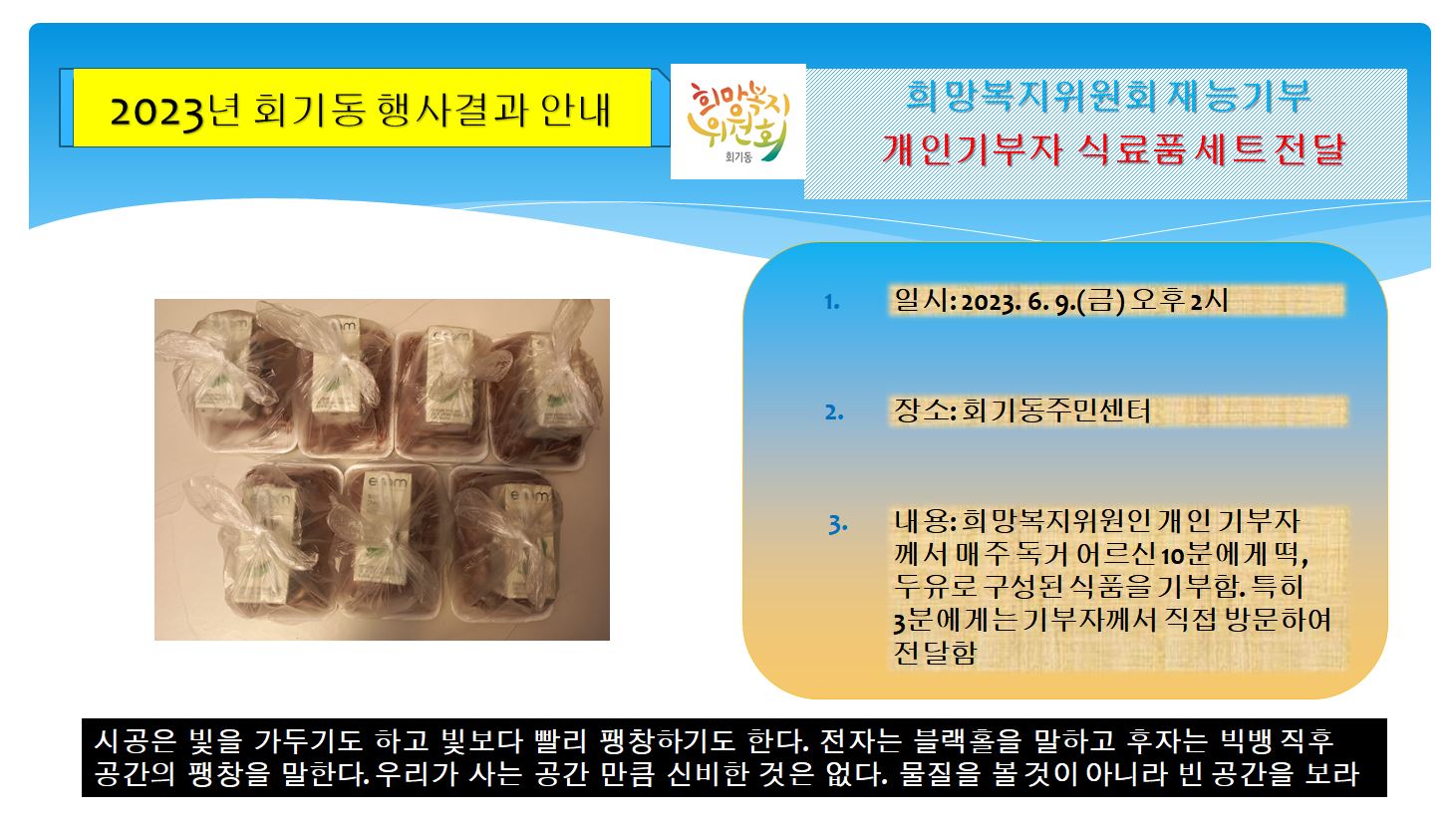 사업/활동 홈 분야별정보 복지 보듬누리 알림마당 사업/활동 즐겨찾기 공유하기 공유하기 페이스북 트위터 블로그 카카오톡 주소복사 인쇄하기 사업/활동 사업/활동 보도/미담 명예의 전당 회기동희망복지위원회 재능기부-개인기부자 식품 나눔 분야별정보 > 복지 > 보듬누리 > 알림마당 > 사업/활동 상세보기 - 제목, 담당부서, 동, 작성일, 내용, 첨부파일 정보 제공 회기동희망복지위원회 재능기부-개인기부자 식품 나눔 작성일 : 2023-06-09 담당부서 회기동 사진 확대보기 재능기부 첨부파일 jpg 문서 6월2주 떡전달.JPG 미리보기 목록 게시물삭제 광고 본인삭제 욕설 반복작성 게시물삭제