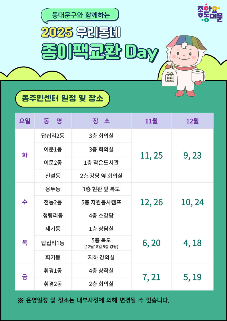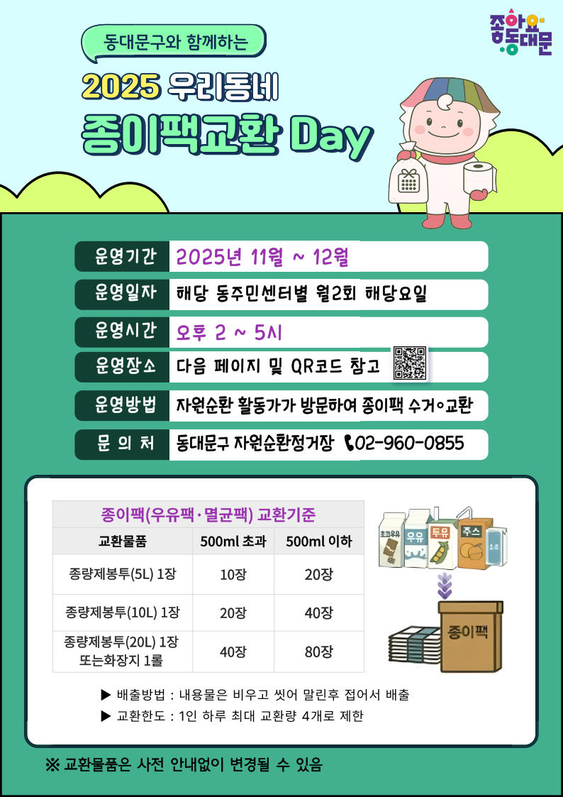 「2025 우리동네 종이팩 교환데이」 운영 연장 안내 가. 운영기간 : 2025. 11. ~ 12. 나. 운영일시 : 해당 동주민센터별 해당요일(월 2회) 14:00 ~ 17:00 ※동별 세부일정은 안내문 참고 다. 운영장소 : 해당 동주민센터 순회운영 라. 운영방법 : 동주민센터로 자원순환 활동가가 방문하여 종이팩 수거·교환 마. 문 의 처 : 동대문구 자원순환정거장 ☎ 02-960-0855 ※자원순환정거장(회기로18길 3)에서는 종이팩 상시 교환 가능 |