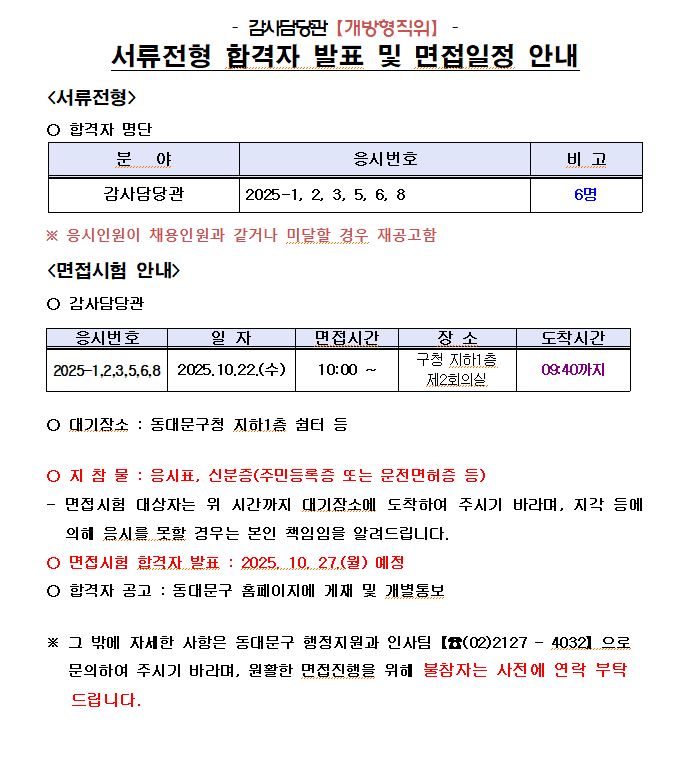 감사담당관(개방형직위) 서류전형 합격자 발표 및 면접일정 안내