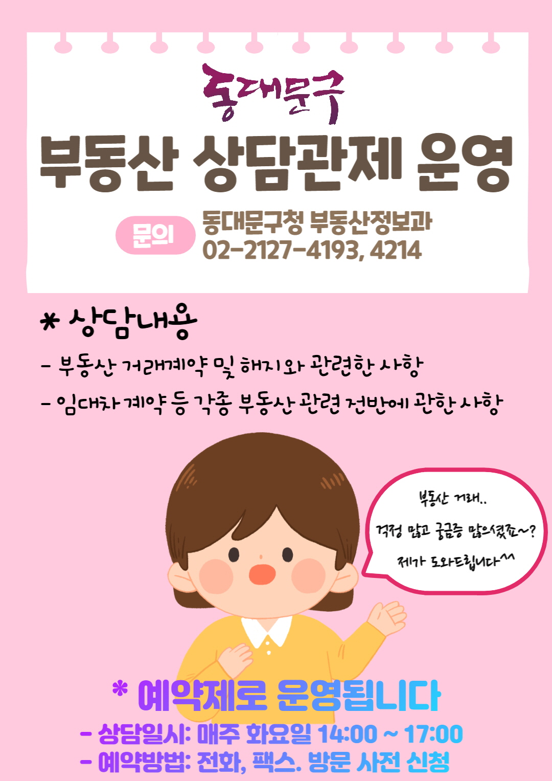 「부동산 상담관제」 관내 부동산에 능통한 개업공인중개사를 부동산 상담관으로 위촉하여 부동산 매매 및 임대차 관련 분쟁, 부동산 거래관련 궁금증에 대해 무료 상담해드립니다. ❍운영기간: 2023. 3. ~ 2024. 2. ❍상담시간: 매주 화요일 14:00 ~ 17:00 ❍상담방법: 대면 상담 또는 비대면 상담 중 선택 ❍상담장소: 구청 상담도움방 또는 상담관의 중개사무소 ❍상담신청: 사전 방문, 전화, 팩스 등으로 예약신청 (☎ 2127-4214 / FAX 02-3299-2635) ❍상담내용 주택임대차계약 전·후 유의사항 중개보수와 관련한 사항 부동산 거래계약 및 해지에 따른 민원사항 각종 부동산 관련 전반에 관한 사항 |